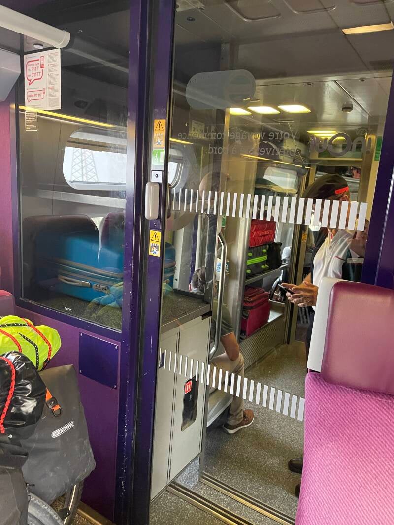What we did not know was what the space would be like on the TGV, all we knew was that our seats were next to them. The space was very tight, and getting our bikes on was really stressful, firstly because it was not easy to see the carriage labels and we were not sure if we were in the right carriage. Having then climbed into the carriage, there was some bloke was blocking the way just inside the door with his drop down seat who was really reluctant to move out of the way, manoeuvring the bikes into the cabin was eventful because once we'd past the first obstacle, the unhelpful guy at the carriage entrance, we then had sliding doors to contend with and a two steps. It felt like the doors kept closing and clamping down on us every other second, it was not amusing.